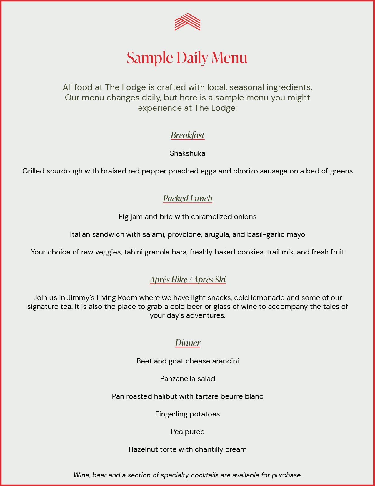 Joining our table for dinner at The Lodge means joining our family. Whether this is your first stay with us or you’re a seasoned visitor, meals are a warm, welcoming time for sharing stories over delicious, comforting food.
